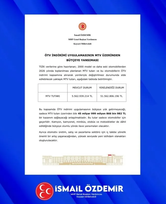 Özdemir, sosyal medya hesabından yaptığı paylaşımda, "TBMM’ye sunduğumuz ve 2000 yılı öncesinde trafiğe kayıtlı araçların yerli üretim araçlarla yenilenmesini öngören kanun teklifimizle trafik güvenliğinin pekiştirilmesi, çevreci araçların teşvik edilerek kullanımının yaygınlaştırılması, ekonomik gelişmelere pozitif yönde katkı sağlanması hedeflerimizi ortaya koymuştuk. Teklifle ilgili bazı kamu kuruluşlarının olumlu yönde görüşe sahip olduğunu bilmekle beraber, ÖTV hususunda kayba neden olacağı endişelerinin ise yersiz bir yaklaşım olacağını ifade etmek gerekir. Zira ÖTV teşvikinin sağlanması ile oluşacak herhangi bir kayıp bulunmamaktadır. Aksine, kanunun gerçekleşmesi halinde ise bilhassa MTV gelirlerindeki yüksek artış sebebiyle bütçemize de olumlu yönde katkısı olacaktır. Bu yönüyle 2026 yılı içerisinde teklif ettiğimiz kanunun yasalaşması halinde merkezi bütçemize 45 milyar liradan fazla ilave bir kaynak sağlanmış olacaktır. Üstelik iç pazar hareketlenmesi ile otomotiv sektörü ve bağlı olan diğer alanlarda ilave istihdam da oluşturabilecektir. Vatandaşlarımızın ihtiyaç ve beklentisi çerçevesinde sunduğumuz kanun teklifimizin kabul edilerek, yürürlülüğe girmesi için gayretle çalışmalarımızı sürdürüyoruz" dedi.