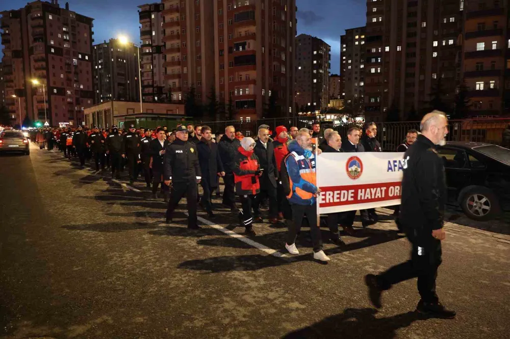Kahramanmaraş merkezli depremlerin 3’üncü yıl dönümü nedeniyle Kayseri’de sessiz yürüyüş düzenlendi. Yürüyüş sonrası 12 bin vatandaşın bulunduğu 45 binada mahalle tahliye tatbikatı yapıldı.