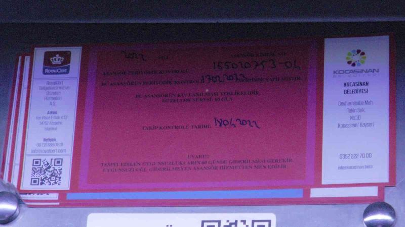 Asansörlerin bakımlarına göre etiketlendiğini söyleyen Makine Mühendisleri Odası Kayseri Şube Başkanı Süleyman Varol, “Asansörlerin yıllık periyodik bakım ve kontrolleri birbirinden farklı. Asansörlerin periyodik bakımlarının yetkili asansör firmaları tarafından her ay düzenli olarak yapılması gerekmektedir. Burada asansör yönetmeliğini belirlediği bazı durumlar var. Bu yönetmelikler çerçevesinde asansörlerin aylık bakımları yapılmalı. Bunun haricinde de asansörlerin yıllık periyodik kontrolleri her yıl A tipi muayene kuruluşunca yapılmalıdır. Burada çeşitli etiketlerle asansör etiketlendirilir. Örneğin kırmızı bir etiket güvensiz bir asansörü gösterir. Sarı etiket kusurlu olduğunu gösterir. Mavi etiket hafif kusurlu şekilde ve kullanılabilir anlamı taşır ve yeşil etiket de tamamen uygun bir asansör olduğunu gösterir” dedi.