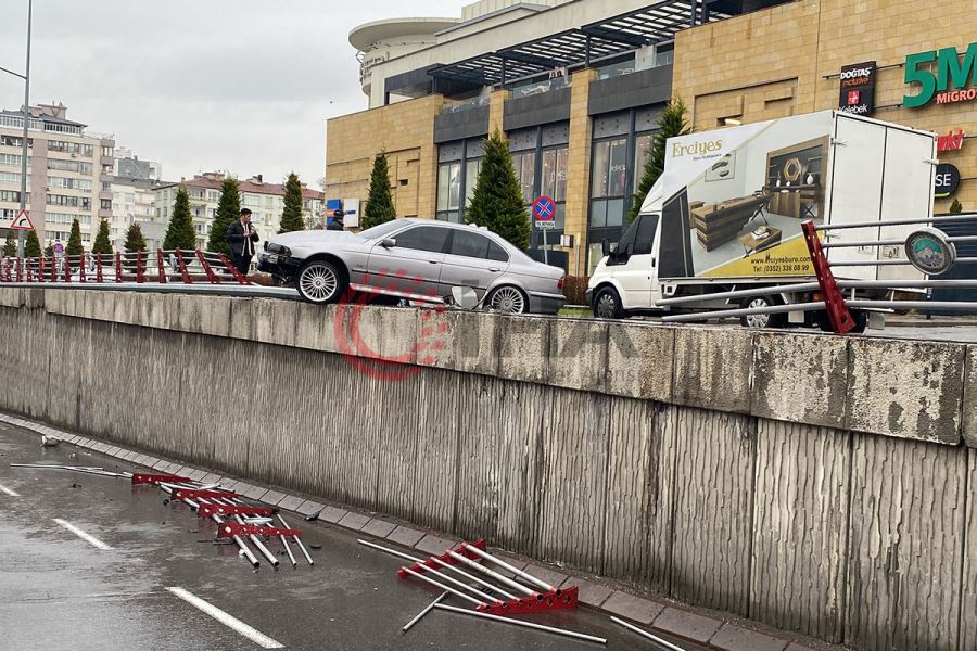 Kayseri’nin Melikgazi ilçesinde bariyerlere çarpan otomobil köprüde asılı kalırken, kazada sürücü yaralandı.