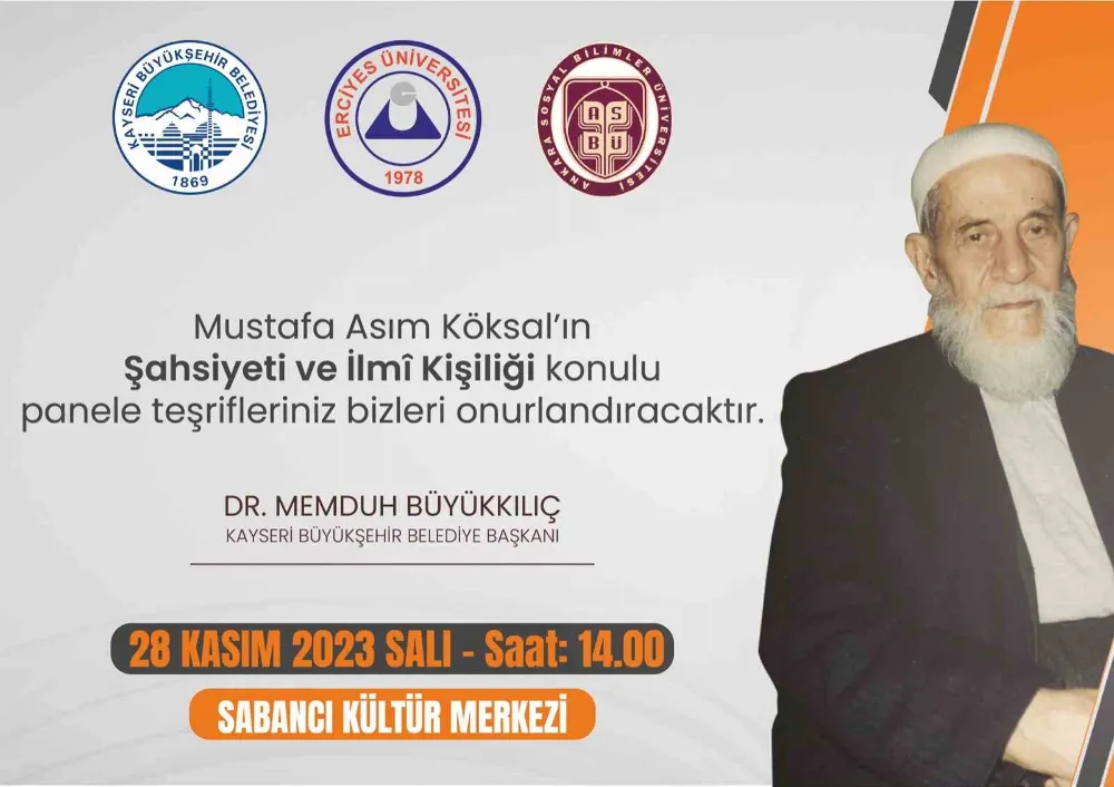 Kayseri Büyükşehir Belediyesi, Erciyes Üniversitesi (ERÜ) ve Ankara Sosyal Bilimler Üniversitesi (ASBÜ) iş birliği ile Kayserili İslam tarihi yazarı, şair ve mutasavvıf Mustafa Asım Köksal’ın ölüm yıl dönümü dolayısıyla ‘Mustafa Asım Köksal’ın Şahsiyeti ve İlmi Kişiliği’ konulu panel düzenliyor.