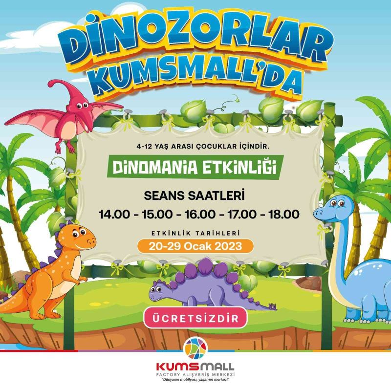 Hafta sonu ile birlikte sömestr tatiline girecek olan öğrenciler KUMSMALL AVM’de dinozorlar çağına yolculuk yapma imkanı bulacaklar. 65 milyon yıl önce nesli tükenen dinozorlar KUMSMALL AVM’nin DİNOMANİA etkinliği ile Kayseri’ye gelecek. Çocukları dinozorlar çağına götürecek olan DİNOMANİA etkinliği 20 Ocak Cuma günü başlayacak ve 29 Ocak tarihine kadar devam edecek. DİNOMANİA etkinlik alanında 4-12 yaş çocukları için her gün saat 14.00, 15.00, 16.00, 17.00 ve 18.00’de farklı faaliyetler gerçekleştirilecek ve bu faaliyetlere çocuklar ücretsiz olarak katılabilecek.