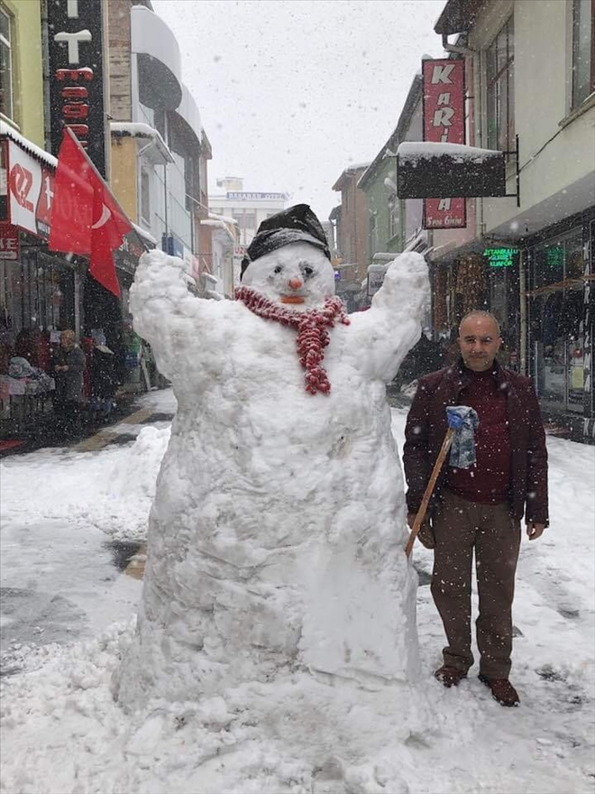 Kayseri´nin Develi ilçesinde yoğun kar yağışı sonrasında esnaflar 2 metre uzunluğunda kardan adam yaptı.