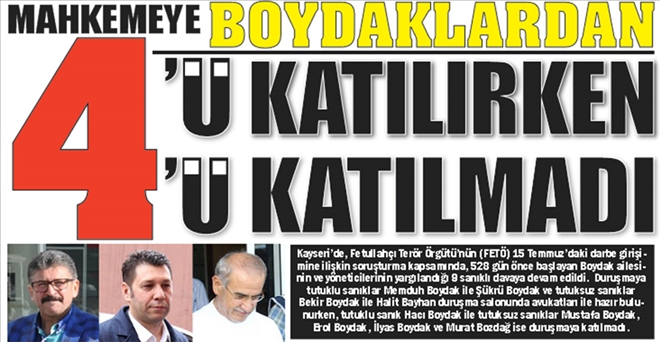 Kayseri 2. Ağır Ceza Mahkemesi´nde görülen davada tutuklu sanıklar Memduh Boydak ile Şükrü Boydak ve tutuksuz sanıklar Bekir Boydak ile Halit Bayhan duruşma salonunda avukatları ile hazır bulunurken, tutuklu sanık Hacı Boydak ile tutuksuz sanıklar Mustafa Boydak, Erol Boydak, İlyas Boydak ve Murat Bozdağ ise duruşmaya katılmadı. Türkiye Cumhuriyeti Başbakanlık avukatı da duruşmada hazır bulundu.