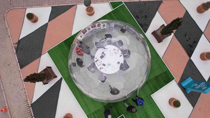 Kayseri’nin Talas İlçe Belediye Başkanı Mustafa Yalçın, iglo şeklinde tasarlanan şeffaf odada vatandaşlarla yüz yüze görüşerek hem sorunlarını dinliyor hem de çözüm buluyor.