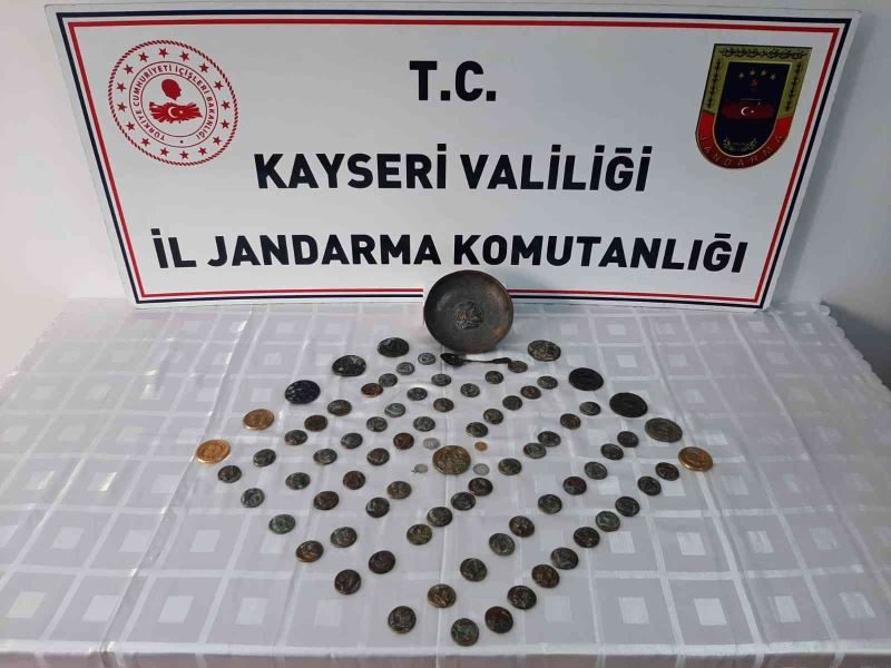 Edinilen bilgiye göre, Kayseri Cumhuriyet Başsavcılığının koordinesinde, Kayseri İl Jandarma Komutanlığı ekipleri tarafından tarihi eser kaçakçılığı ile mücadele çerçevesinde çalışma yapıldı. Kocasinan ilçesinde bir şahsın aracında arama yapan ekipler, Bizans ve Roma dönemlerine ait 103 adet sikke ve tarihi obje ele geçirdi.