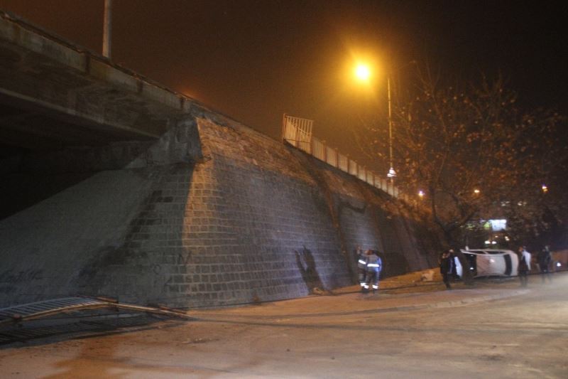 Kayseri’nin Kocasinan ilçesinde önündeki araca çarptıktan sonra kontrolünü kaybeden sürücü 20 metre yükseklikteki köprüden uçtu. Kazada araç hurdaya dönerken 3 kişi yaralandı.