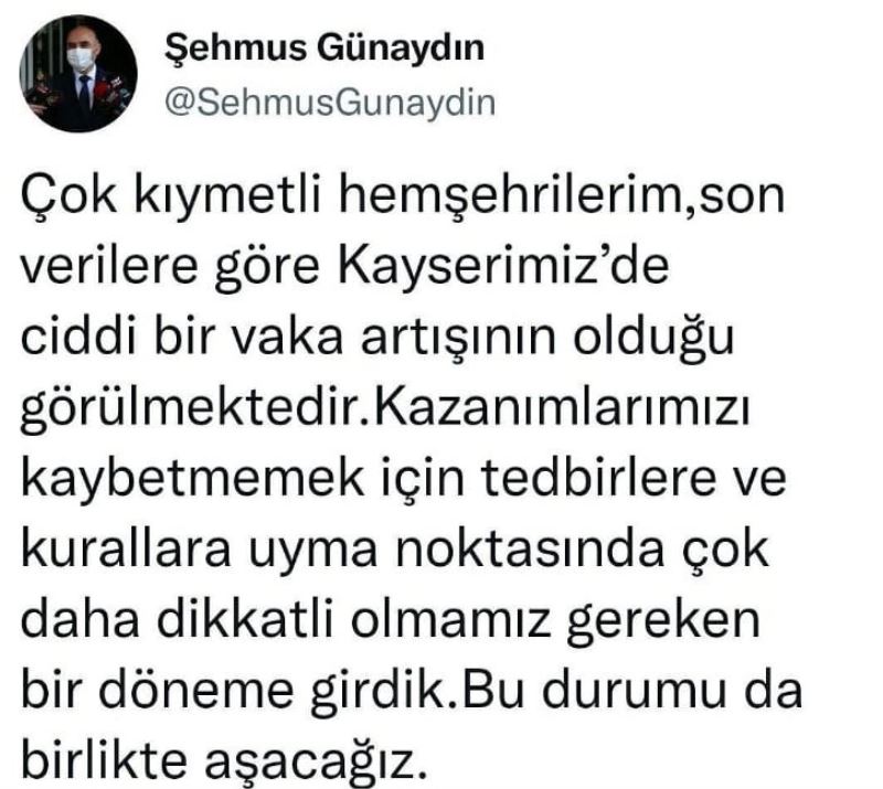 Kayseri Valisi Şehmus Günaydın, Twitter hesabından yaptığı paylaşımda; Çok kıymetli hemşehrilerim, son verilere göre Kayserimizde ciddi bir vaka artışının olduğu görülmektedir. Kazanımlarımızı kaybetmemek için tedbirlere ve kurallara uyma noktasında çok daha dikkatli olmamız gereken bir döneme girdik. Bu durumu da birlikte aşacağız"