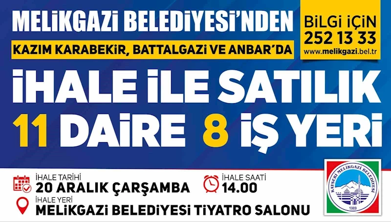 MELİKGAZİ BELEDİYESİ, KAZIM KARABEKİR, ANBAR VE BATTALGAZİ MAHALLESİ’NDE MÜLKİYETİ KENDİSİNE AİT OLAN 11 ADET DAİRE VE 8 ADET İŞYERİNİN 20 ARALIK 2023 ÇARŞAMBA GÜNÜ SAAT 14.00’TE İHALE İLE SATIŞINI GERÇEKLEŞTİRECEK.