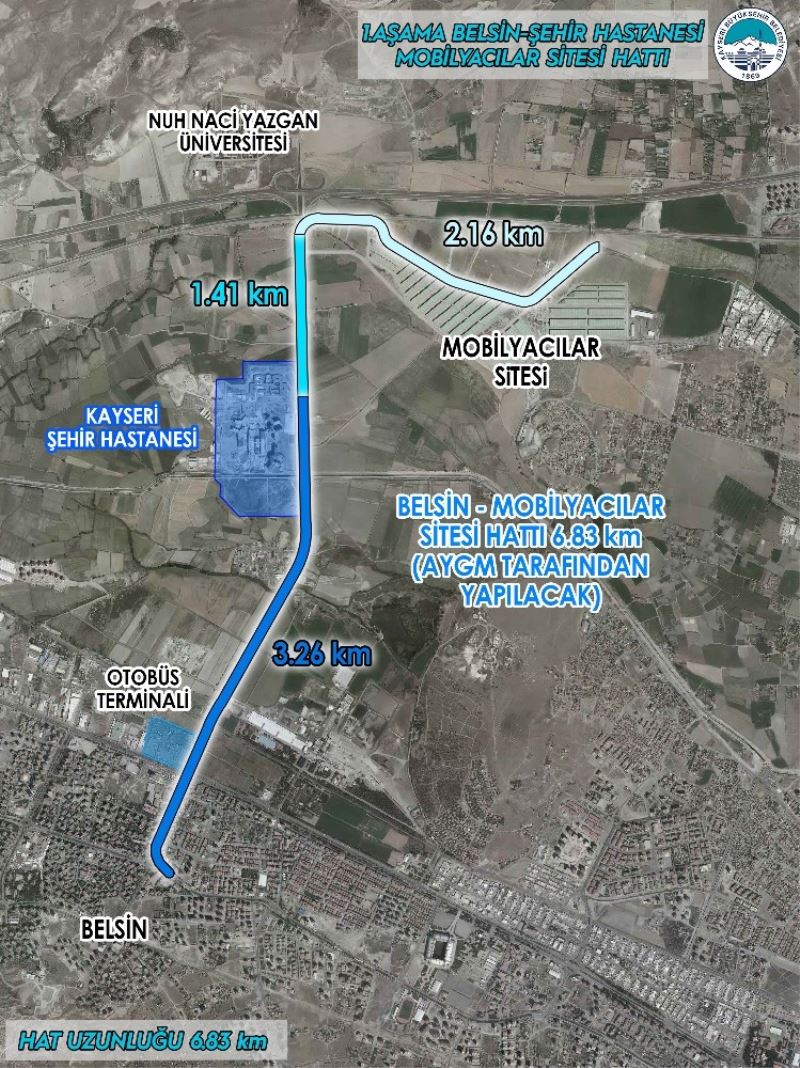 Kayseri Büyükşehir Belediye Başkanı Dr. Memduh Büyükkılıç, Belsin’den, Şehirlerarası Otobüs Terminali, Kayseri Şehir Hastanesi, Nuh Naci Yazgan Üniversitesi ve Mobilyakent ile YHT garı istikametine kadar uzanacak olan tramvay hattının temelini Ulaştırma ve Altyapı Bakanı Adil Karaismailoğlu’nun katılımıyla atacaklarını söyledi.