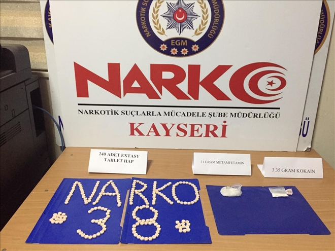 Edinilen bilgiye göre kente batı illerinden uyuşturucu madde getirileceği bilgisi üzerine Narkotik Şube Müdürlüğü ekiplerince yapılan çalışmalarda bir yolcu otobüsünde R.Y. (36) yakalandı. Yapılan aramada R.Y.´nin iç çamaşırına gizlenmiş şekilde 240 adet extacy hap, 2 parça halinde 3,5 gram kokain, 11 gram metemfetamin ele geçirildi. R.Y. ´uyuşturucu madde ticareti yapmak´ suçundan gözaltına alındı.